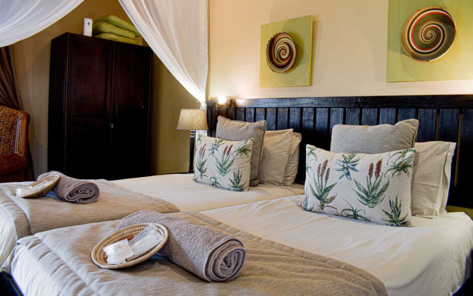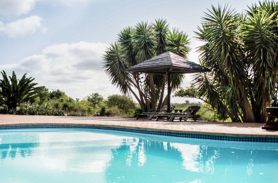 The lodge: African Spirit Game Lodge main lodge features a comfortable and relaxed dining room, cosy lounge, bar with viewing deck, open fireplace attached to the lodge and a swimming pool with a thatched gazebo, offering our guest a welcome retreat after a day in the African bush. Our meals are your typical South African cuisine which ensures that you will never go hungry and will enjoy every bite that is carefully prepared by our cooks. Our catered accommodation consists of 4 quaint, fully serviced chalets. Each comfortable and stylish chalet accommodates 2 people with an en-suite bathroom, air-conditioner, mini bar, ceiling fan, tea and coffee facilities. Includes dinner, bed and breakfast, plus 2 game drives each day.